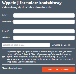 Ta czynność spowoduje przeniesienie Cię do Formularza kontaktowego - pierwszego kroku w procesie uzyskania konta w Gabinet drWidget.